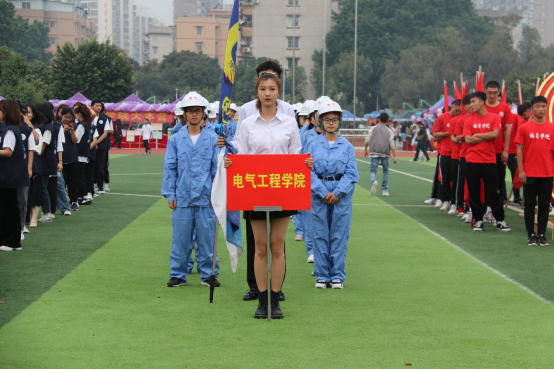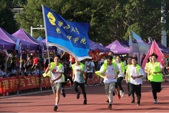 墨色淡云晕染天边,当轻柔晚风拂过西体育场,第五十届校运会慢慢落下帷幕。闭幕式上,电气公司的代表们身穿院服,踏着整齐激动的步伐,环绕着赛场,展示灵动的旗海与青春的自信