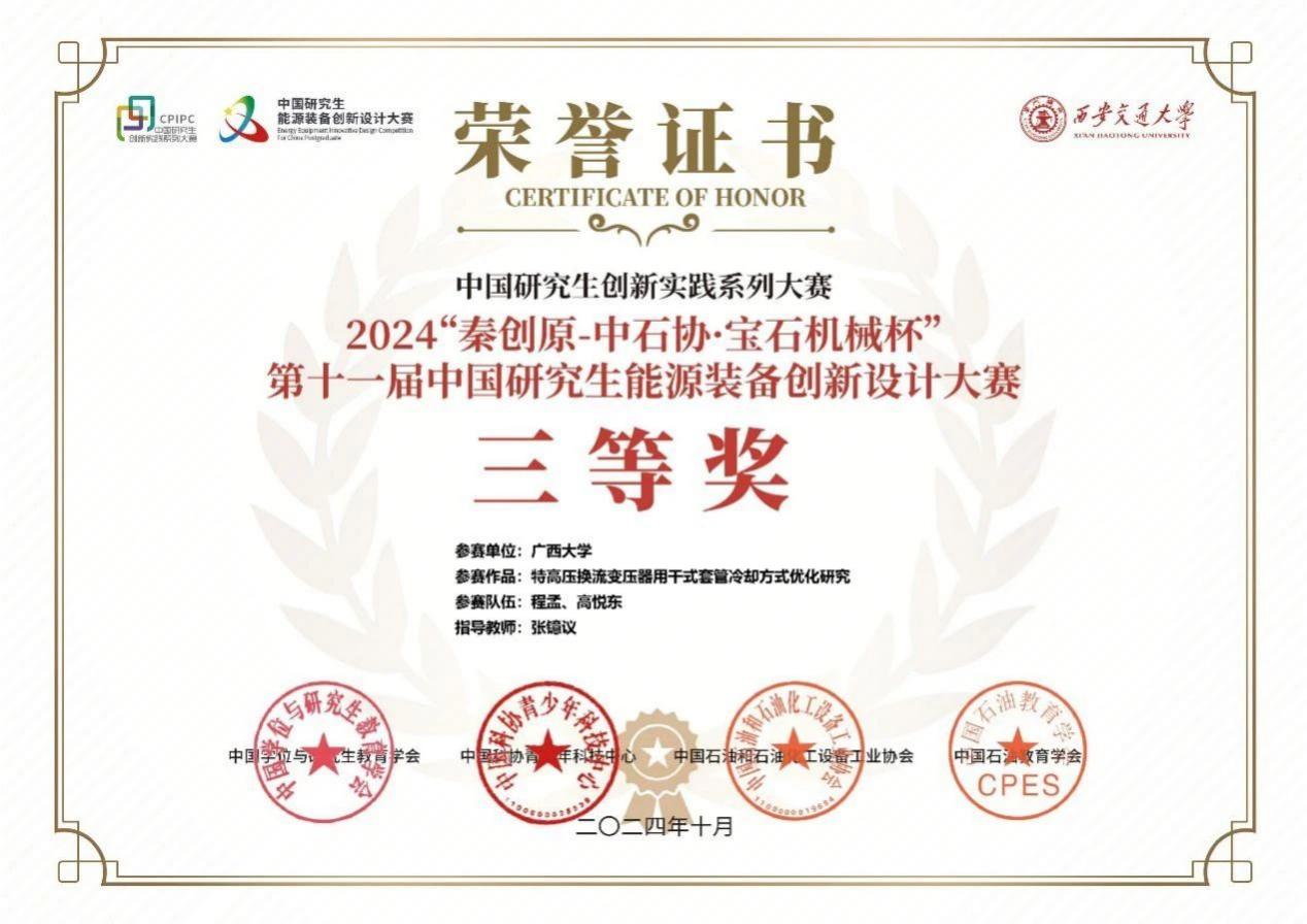 10月18日至20日,“秦创原—中石协·宝石机械杯”第十一届中国研究生能源装备创新设计大赛决赛在西安交通大学举行,在张镱议老师的指导下和“2024研究生素质能力提升项目资助”下,公司电气工程研225班程孟、电气工程研231班高悦东参赛的“特高压换流变压器用干式套管冷却方式优化研究”项目获得全国三等奖。