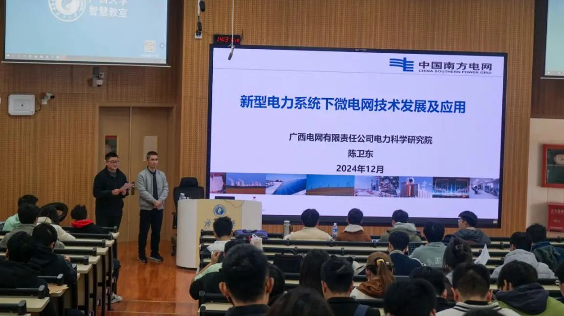 为提升公司员工工程应用与实践能力,了解当下学科前沿,助力其成长成才,12月13日下午,由公司主办,william威廉亚洲电力系统最优化研究所、公司团委、研究生会、员工会承办的第2期“行业大咖进课堂”暨电气工程学科前沿讲座在东10A-305举行。广西电网公司电力科学研究院智能电网研究所副经理、高级工程师、三级领军专业技术专家陈卫东受邀到公司为师生们作题为“新型电力系统下微电网技术发展及应用”的讲座。公司2024级电气工程专业全体博士、硕士研究生,部分本科生,共计300余人参与活动。本次讲座由电气工程系副主任代伟副教授主持。 陈卫东老师以讲述“新型电力系统的特征”为着力点展开,结合李立浧院士对当下新型电力系统的十大新技术的思考先是介绍了广西电网负荷变化趋势,随后介绍微电网的发展情况和形式架构。 在对微电网控制技术的介绍中,陈卫东老师先讲述了结合p-f控制和下垂控制的相关技术模拟传统同步电机和简单电力系统的一次调频切入主题,然后正式介绍基于虚拟同步发电机(VSG)的微电网控制技术,并介绍了变换器参与控制一次调频的基本原理。最后,陈卫东老师结合广西电网的微电网实证平台,向同学们演示并讲解了微电网群并网、离网和运行状态转换等实验。 在交流与答疑环节,在座的老师同学们就微电网控制和运维、电科院研究概况等问题向陈卫东老师请教,陈卫东老师耐心地解答了同学们的疑惑。在场的同学们纷纷表示受益匪浅,对未来的研究与发展有了更明确的方向。 此次“面向新型电力系统的虚拟电厂关键技术及应用”讲座让同学们了解了新型电力系统的发展情况、微电网的控制与运维和虚拟电厂的相关概念,鼓励同学们树立远大理想和奋斗目标,为未来科研发展奠定了坚实的基础。