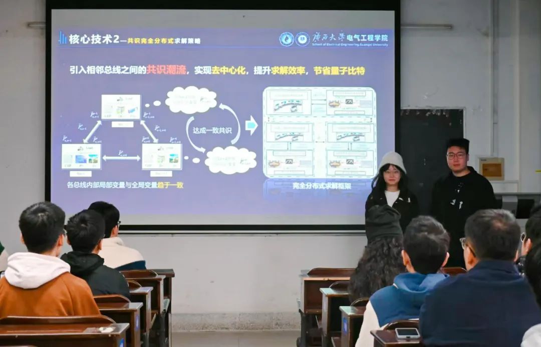 为进一步增强公司学子创新意识和创新精神,提升创新创业能力,12月11日下午,由公司团委指导、研究生会主办的“解锁学科竞赛密码经验分享会”在公司304教室举行。分享会邀请了第十九届“挑战杯”全国老员工课外学术科技作品竞赛2024年度“揭榜挂帅”专项赛特等奖获奖项目《面向电力系统机组组合场景优化问题的混合量子——经典算法》主要负责人王逸斐、路宜宁,进行主题为“量子经典共舞,赋能电力优化”的经验分享。现场100余人参加活动。 分享会上,王逸斐详细介绍了挑战杯“揭榜挂帅”的内涵,阐释“小挑赛”“大挑赛”“揭榜挂帅”的区别,梳理赛制流程与比赛时间,并对挑战杯命题选择和解读给予申报建议。他还回顾了自己的参赛经历,从初赛准备到决赛通知、流程,毫无保留地分享了决赛答辩的PPT修改、演讲稿打磨、演讲技巧、答辩问题准备、答辩建议及注意事项,同时展示了答辩PPT的结构,包括命题介绍、背景、分析、技术现状与痛点、作品亮点、核心技术、技术优势、项目成果、校企合作、未来规划和团队成员介绍等板块。最后向在场的同学们完整展示了获奖项目在正式比赛时的答辩PPT。 在交流互动环节,王逸斐、路宜宁对同学们提出的答辩及PPT讲解流程、PPT动图制作、量子优化算法与粒子群算法区别、核心技术可行性、挑战杯对数学能力要求等问题一一详细解答,同学们表示收获满满。 此次经验分享活动为同学们参与学科竞赛提供了宝贵经验,鼓舞了同学们积极投身学科竞赛的热情与信心。未来,公司将搭建更多实践平台,鼓励同学们探索学科前沿,将理论知识转化为实际应用,为培养具有创新精神和社会责任感的高素质人才奠定坚实基础,为加快实现高水平科技自立自强贡献力量。