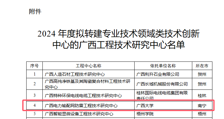 近日,广西壮族自治区发布了2024年度拟转建专业技术领域类技术创新中心的广西工程技术研究中心名单,广西电力输配网防雷工程技术研究中心入选,已经成功转建为广西电力输配网防雷工程技术创新中心,后续因研究方向拓展,将更名为广西电力装备及系统安全技术创新中心(以下简称“中心”)。该中心以产业前沿引领技术和关键共性技术研发与应用为核心,加强应用基础研究,协同推进现代工程技术和颠覆性技术创新,打造创新资源集聚、组织运行开放、治理结构多元化的综合性产业技术平台。中心主要研究广西复杂气候环境下电力装备及绝缘材料安全、数字化防爆电力装备及系统运行安全、电力装备的在线监测和雷电防护等方向,由广西壮族自治区优秀专家、公司教授张镱议担任负责人。