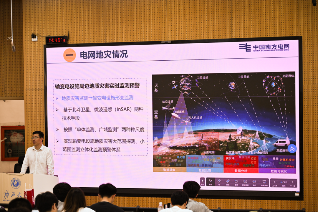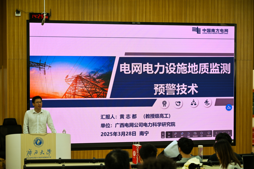 为提升公司员工工程应用与实践能力,了解当下科研工作前沿,助力其成长成才,3月28日下午,公司在东10A-305教室举行第7期“行业大咖进课堂”暨电气工程学科前沿讲座。广西电网公司电力科学研究院教授级高工黄志都受邀到公司为师生们作题为“电网地质灾害监测预警技术”的讲座,公司2024级电气工程专业全体博士、硕士及部分本科生共250余人参与讲座。 黄志都高工正在授课 讲座伊始,黄志都高工从电网输电通道周边地质灾害情况切入,迅速吸引了同学们的注意力。随后,他讲述了基于北斗卫星和微波遥感(InSAR)两种技术手段的应用方法,此方法能同时按照“单体监测、广域监测”两种尺度实现输变电设施地质灾害大范围探测、小范围监测立体化监测预警体系,并能够实现三维可视化展示。 黄志都高工介绍电网地灾情况 其中,InSAR遥感监测技术的特点在于设计了输变电设施地质灾害监测系统的架构,包括北斗实时单体监测、遥感InSAR局域监测和输电杆塔三维可视化这三大基本模块。黄志都高工结合广西电网历史地质灾害情况,向同学们深入讲解了InSAR遥感监测的具体应用案例,并清晰地展现了InSAR遥感监测手段能够针对每个遥感点生成不同颜色的标识,以及相关地形变化数据和曲线。 同学们认真听课与做笔记 此次讲座不仅拓宽了同学们的学术视野,激发了同学们对前沿技术的浓厚兴趣和深入探索的动力。同时,黄志都高工关于实践经验与行业洞察的分享,也为同学们未来的职业规划提供了宝贵的指导和启发。未来,公司将继续开展“行业大咖进课堂”系列活动,通过持续深化校企合作课程体系建设,推动产学研协同发展,共同打造科技创新与高素质人才培养的双赢格局。
