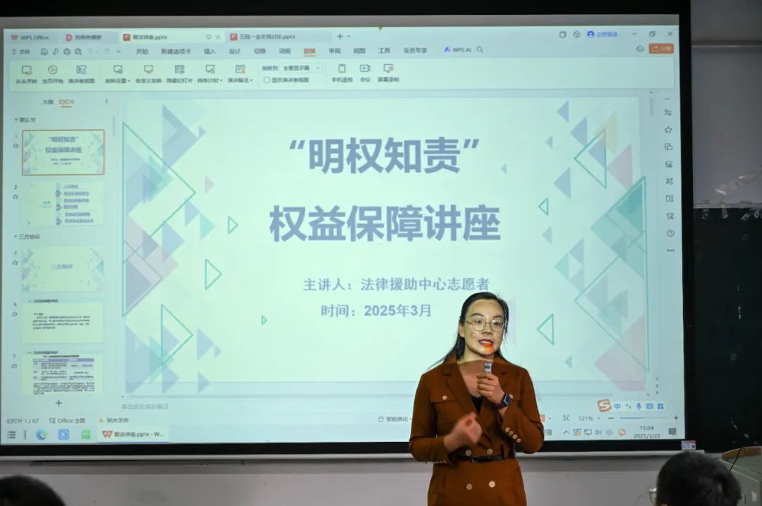 在 “劳动者权益保障” 主题分享环节,农玮琳为同学们系统解读了有关三方协议的知识,着重点明了签订三方协议时的注意事项。随后,她借助视频等形式,为同学们普及了劳动合同审查与解除、薪资问题以及劳动争议解决方式等法律知识,同时提醒同学们在未来求职过程中要擦亮双眼,勇于捍卫自己作为劳动者的合法权益。
