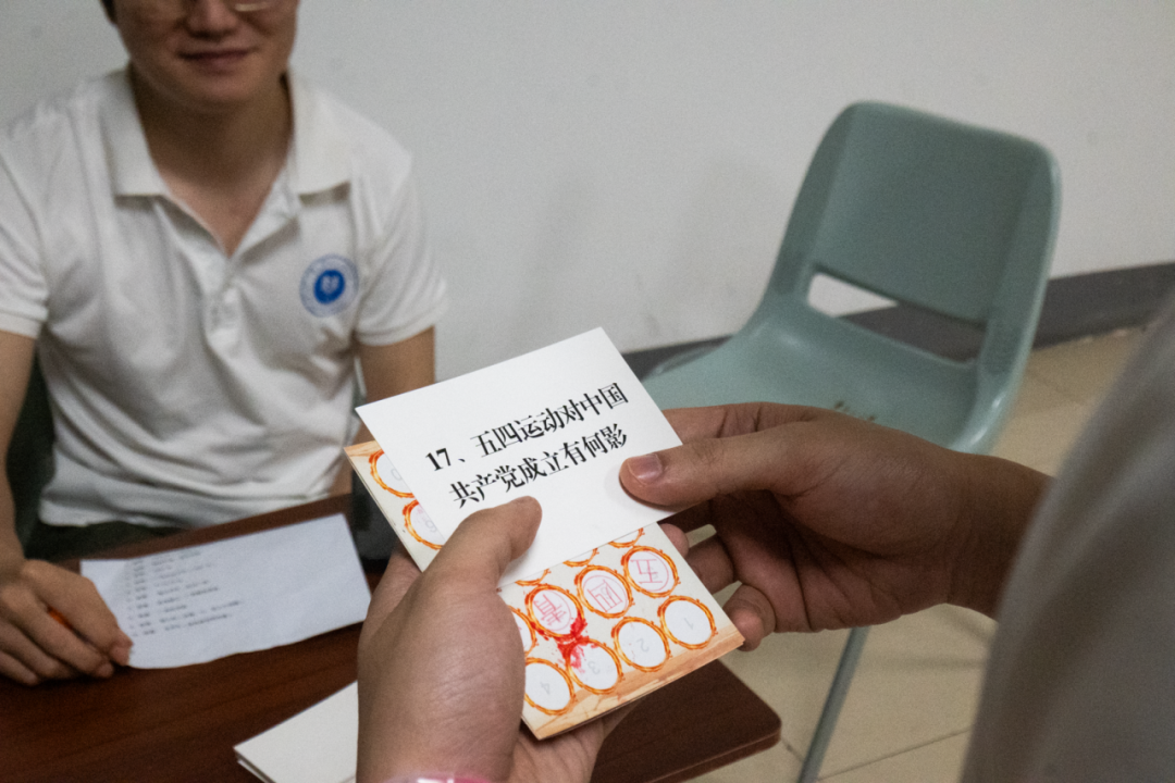 “五四运动爆发于哪一年?”“五四精神的核心是什么?”同学们通过随机抽取卡片巩固党史知识,在理论学习中筑牢信仰之基。