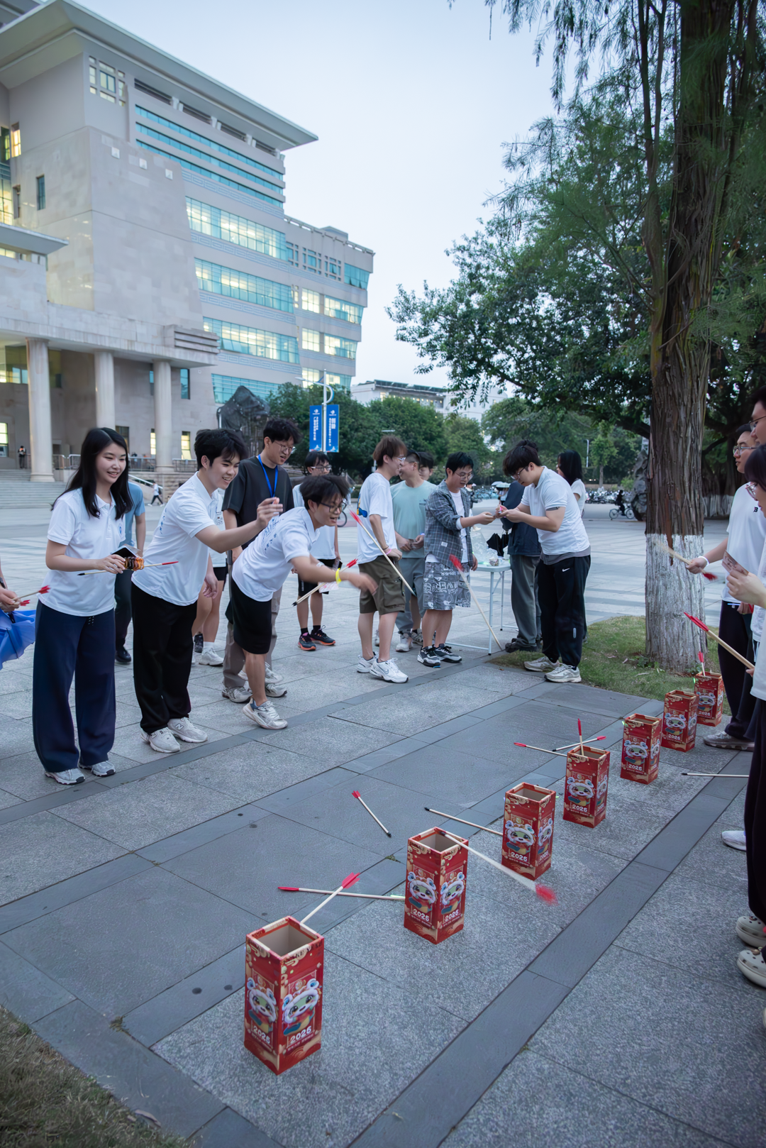 投壶筒上标注“爱国”、“进步”、“科学”、“民主”四大主题,参与者用荧光棒投掷,每中一箭即点亮一项精神标识。游戏既考验技巧,更传递新青年敢于拼搏、勇担使命的品质。