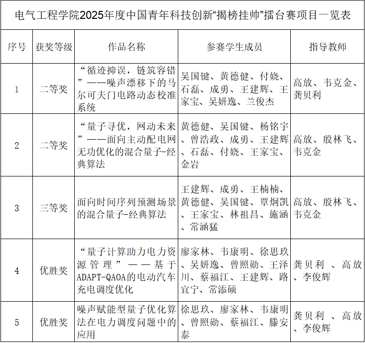 2025年度中国青年科技创新“揭榜挂帅”擂台赛新一代信息技术领域主擂台赛终审于10月26日至28日在西部科学城重庆高新区举行。经过激烈角逐,公司参赛团队发挥出色,最终荣获二等奖2项、三等奖1项、优胜奖2项,充分展现了公司青年学子扎实的专业功底和活跃的科技创新实力。 一直以来,公司高度重视员工科技创新能力培养,始终坚持以赛促学、以赛促创的理念。依托学科特色和专业优势,积极搭建科研训练平台,整合校内外优质资源,为参赛团队提供专业指导。从电气工程领域相关项目的选题孵化、多学科交叉团队的组建,到赛前系统的技术培训与模拟演练,公司在电力系统、新能源技术、智能控制等方向给予全方位支持,为员工的科研探索与创新实践提供坚实保障。 本次参赛项目均聚焦量子科技核心领域,围绕量子计算技术攻关与场景应用展开,对接国家“十五五”规划重点产业布局。量子科技是国家“十五五”核心发展方向,公司拥有扎实的研究积淀,并依托前沿量子技术突破形成创新势能;在竞赛培育中,公司统筹资源、强化专业指导,力争持续产出高水平竞赛成果。 项目介绍 本届赛事由共青团中央联合中国科协等五部委共同主办,共青团重庆市委和重庆高新区管委会承办,以“企业出题、青年破题”为机制,聚焦芯片设计、量子算法、空天互联等关键领域,精准发布21项技术难题,推动产学研深度融合的创新闭环。该擂台赛不仅为青年科技人才提供了展示创新能力的国家级平台,更有力推动了区域产业升级与新质生产力培育,为加快建成具有全国影响力的科技创新中心注入青春动能。 据悉,此次赛事共吸引全国378所高校的1200余支团队及50余支青年科技人才团队报名。经初审,500余支优秀团队晋级终审。终审将评选出多名“擂主”,发榜单位不仅提供总额逾500万元的奖金池,还将为优胜方案提供产业化对接机会,切实推动科技成果转化。 未来,公司将继续深化与电力企业、能源集团的产学研合作,不断丰富员工在电气工程领域的实战经验,孵化更多技术领先、应用性强的高水平项目,全面提升员工的创新创业能力,努力培养更多适应行业发展需求、具备创新精神和实践能力的高素质人才。 参赛选手合影