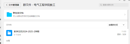 (2)收集方式:进教工QQ群界面—文件—教学日历2024-2025-2学期,上传文件夹,或发邮箱dqjx_gxu@163.com、或教学秘书QQ邮箱。