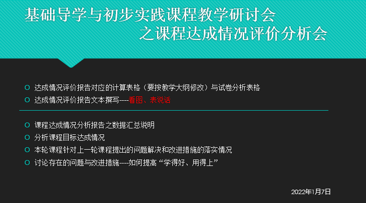 为总结基础导学与初步实践课程2021-2022(1)学期的教学情况,2022年1月7日下午3点课程组在312开展课程达成情况评价分析会。分析会上展示了本这期全体员工学习的相关数据,并对课程达成情况和答卷情况进行了说明,总结了课程的不足,并讨论了改进措施。