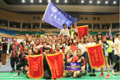 啦啦操队员们们身着黑红相间的国风队服,旋转、挥臂、跳跃,红丝带、黑衣袂也随之一起舞动。独特的队形编排,如轻燕伏巢,似雄鹰疾翔,每一次变换都让人意想不到,每个动作都使人为之喝彩。他们激扬青春,彰显活力,在赛场上彰显了啦啦操比赛精神、展示了不一般的电气风采。