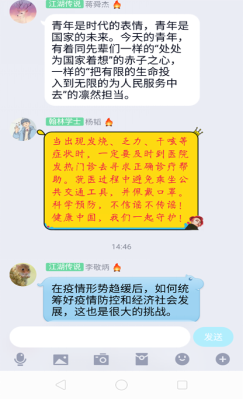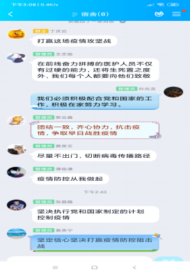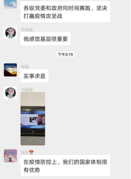 研究生193班徐丹阳(湖北籍):四位老师分别从中国举措、疫情启示、历史磨难、青春蝶变四个角度为我们深刻讲解了当下疫情的思考,也给了我很多启发。
