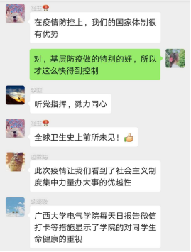 电气类185班员工: 通过这堂疫情防控思政大课,我们看到了在党的领导下,基层党组织雷利风行,快速建立起了疫情防疫团队。全国各省相互支援,互帮互助。在这次疫情当中,全国人民齐心协力共同抗疫,彰显了中华民族伟大的团结精神。党和政府在这次疫情中发挥了巨大作用,体现了党中央的应变紧急情况能力,我们要总结历史经验,坚持党的领导。
