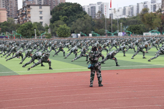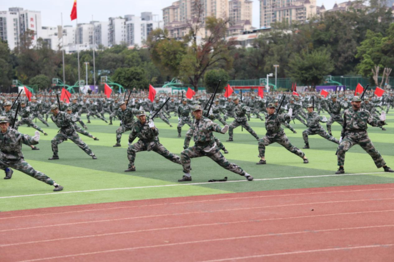 最后教官方队来了,他们左手持盾,右手持军棍,排列成整齐的队列,气势如虹,他们时而变化队列,时而用手中的军棍击打盾牌,发出了雄厚的声音,他们是太阳,在和平年代燃烧自己来守护祖国;他们是健松,庇护着我们。正是他们,我们才能够在一个和平的氛围中学习工作。向他们致敬!