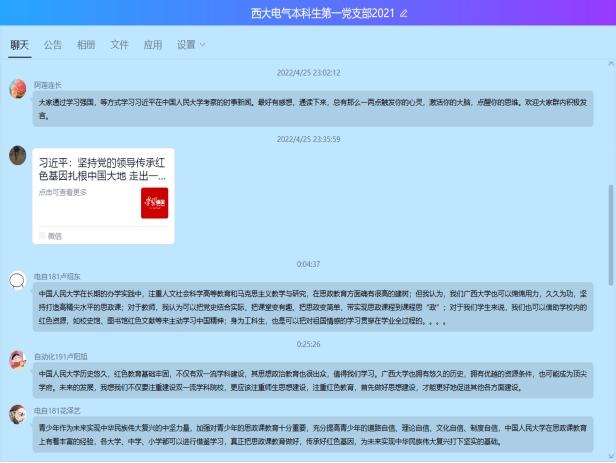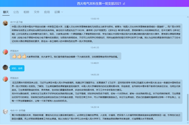 在党支部书记蒋冬连老师的主持下,本科生第一党支部的党员通过学习强国、微信公众号、官方网站等途径积极开展学习交流,并针对这一主题在线上进行了热烈的讨论和感悟分享。